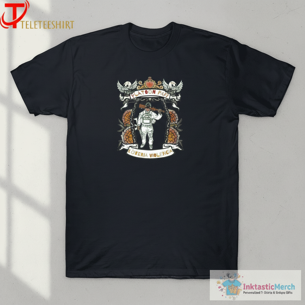 Show off your unique style with the Muerto Papi Platoon Papi Loteria Violencia T-shirt from InktasticMerch. Made from an ultra-soft, premium cotton blend, this tee offers both comfort and durability. Its unique design blends cultural elements with a modern vibe, making it a statement piece for those who aren’t afraid to stand out.