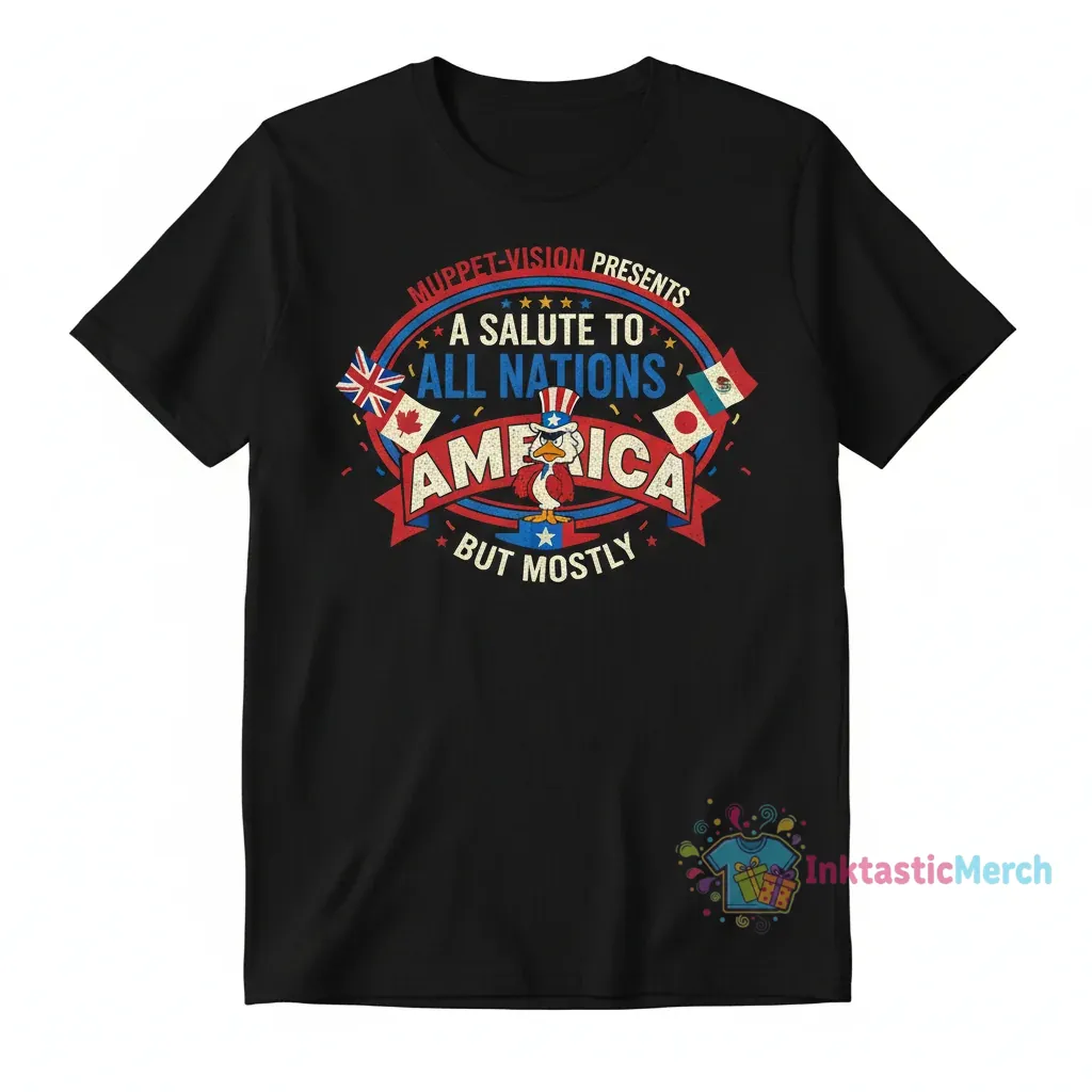 Show your patriotic spirit with a touch of Muppet humor with the Muppet-Vision “Salute to All Nations (Mostly America)” T-Shirt, designed for comfort and lasting wear. Crafted with 100% premium pre-shrunk cotton and vibrant, eco-friendly inks, this tee by InktasticMerch embodies the playful defiance and charm of the Muppets.