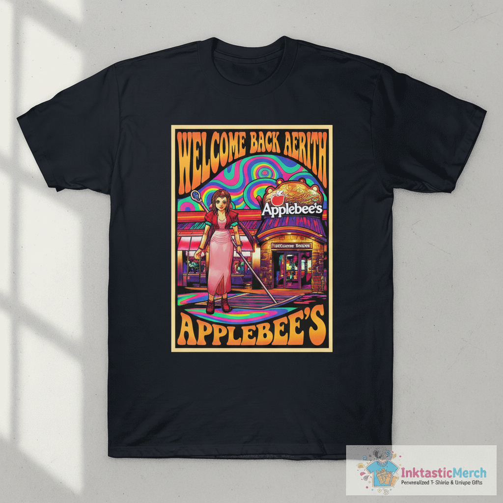 This t-shirt is ideal for casual outings, fan conventions, gaming sessions, or simply lounging around. It makes a fantastic gift for anyone who loves Aerith, gaming, or has fond memories of Applebee’s. Wear it to express your unique style and connect with others who share your interests. It’s the perfect addition to any fan’s collection, offering both comfort and a statement piece.