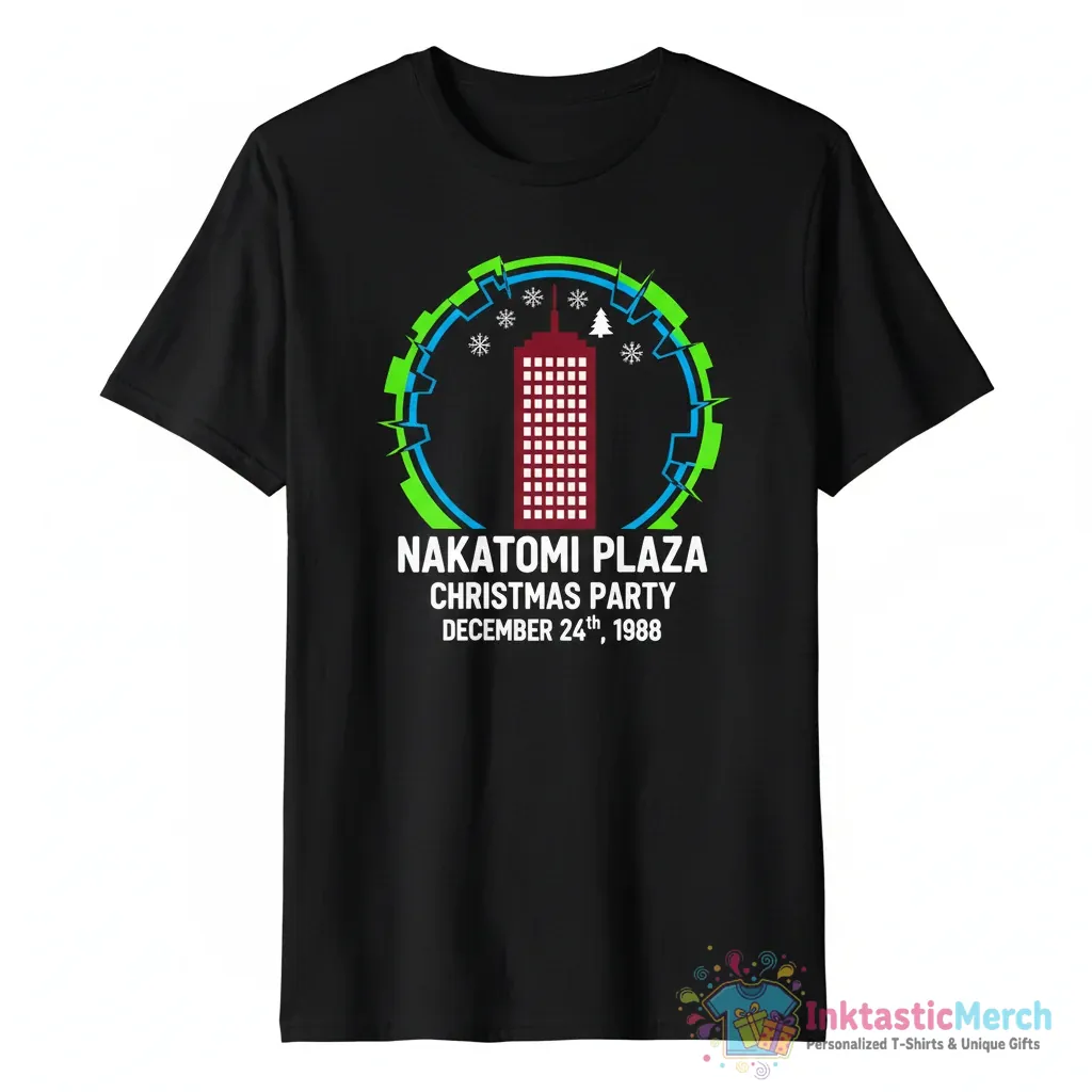 Celebrate the iconic Nakatomi Plaza Christmas party with this nostalgic Nakatomi Plaza Christmas Party December 24th 1988 shirt from InktasticMerch. This premium quality tee captures the spirit of that legendary 1988 event, making it a must-have for fans and anyone who appreciates a bit of movie history.