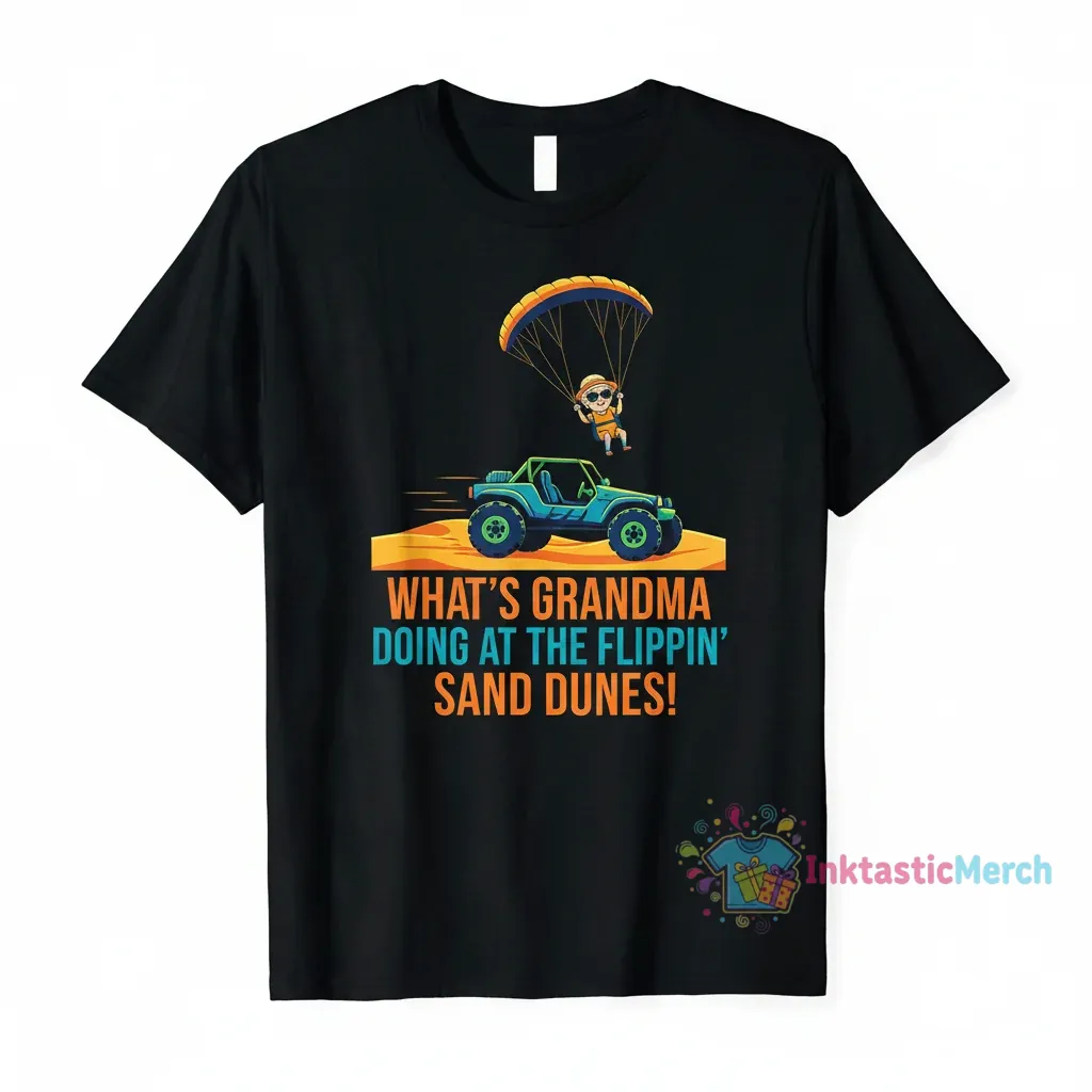 The ‘What’s Grandma doing at the flippin’ sand dunes!’ tee is your go-to for instant cool. Rock it with baggy denim and fresh kicks for a classic streetwear look. Layer it under an open flannel or a statement jacket for added edge. Its clean design makes it effortlessly pairable with anything in your wardrobe, offering a chill yet impactful aesthetic.