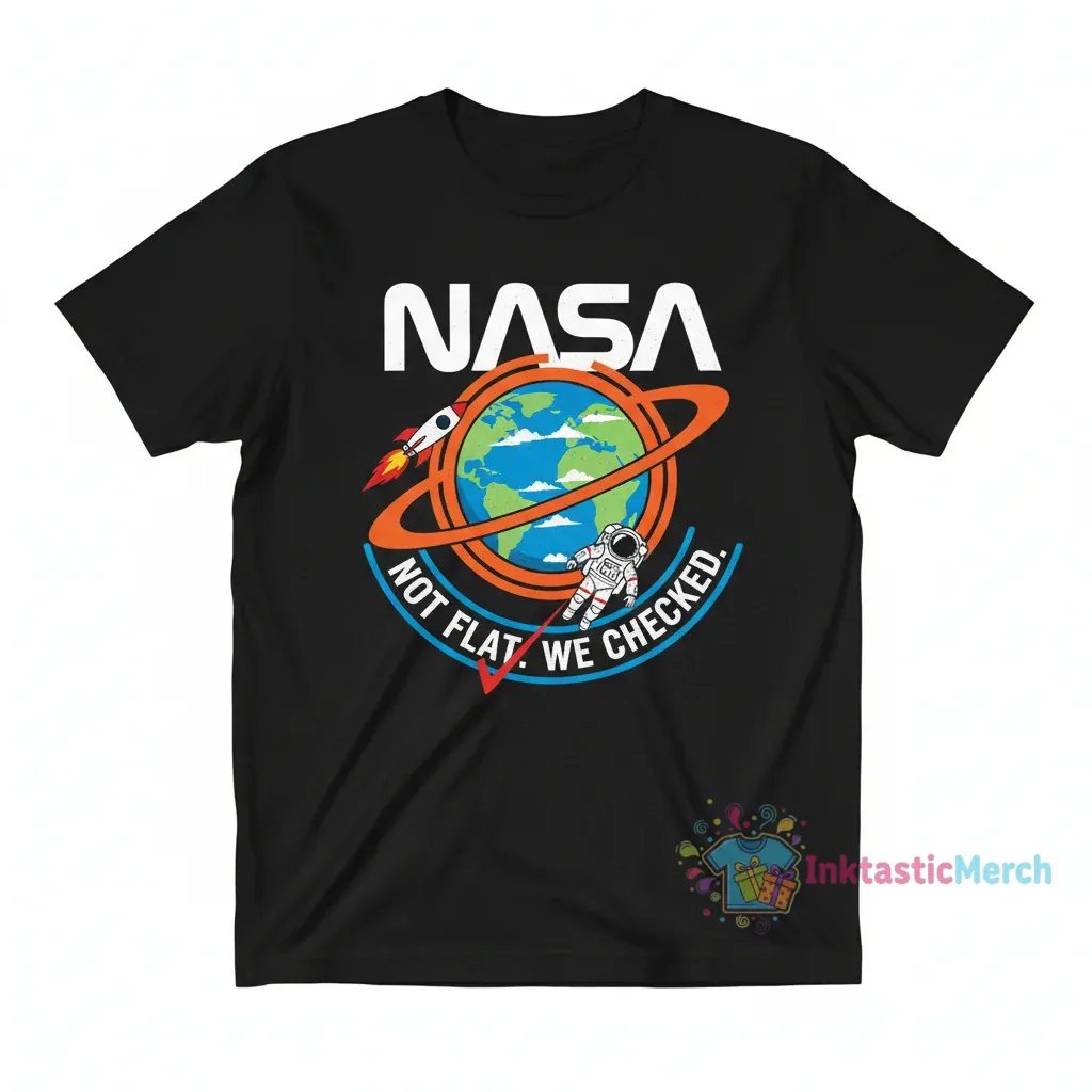 Showcase your scientific skepticism and sense of humor with this NASA Not Flat We Checked T-Shirt from InktasticMerch. Crafted from 100% ring-spun cotton, this tee offers exceptional softness and breathability, ensuring comfort for everyday wear. Its pre-shrunk fabric and durable construction guarantee it will remain a favorite in your collection.