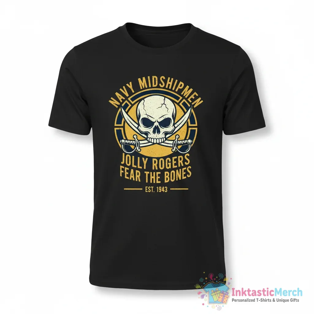 Show your pride with the iconic Navy Midshipmen Jolly Rogers Skull Logo T-Shirt, proudly celebrating its heritage since 1943. Crafted for both comfort and durability from incredibly soft fabric, this tee features the bold “fear the bones” skull design, making it a perfect way to represent your team spirit with a classic, eye-catching look from inktasticmerch.com.