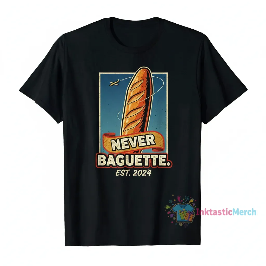 Tired of t-shirts that lose their shape or fade? Introducing the Never Baguette 9/11 Attacks Meme Shirt, a statement piece built to last, offering a unique blend of humor and enduring quality. Engineered for maximum comfort with 100% premium pre-shrunk cotton and vibrant, eco-friendly inks that resist fading, this shirt ensures a lasting fit and softness. Discover more at inktasticmerch.com.