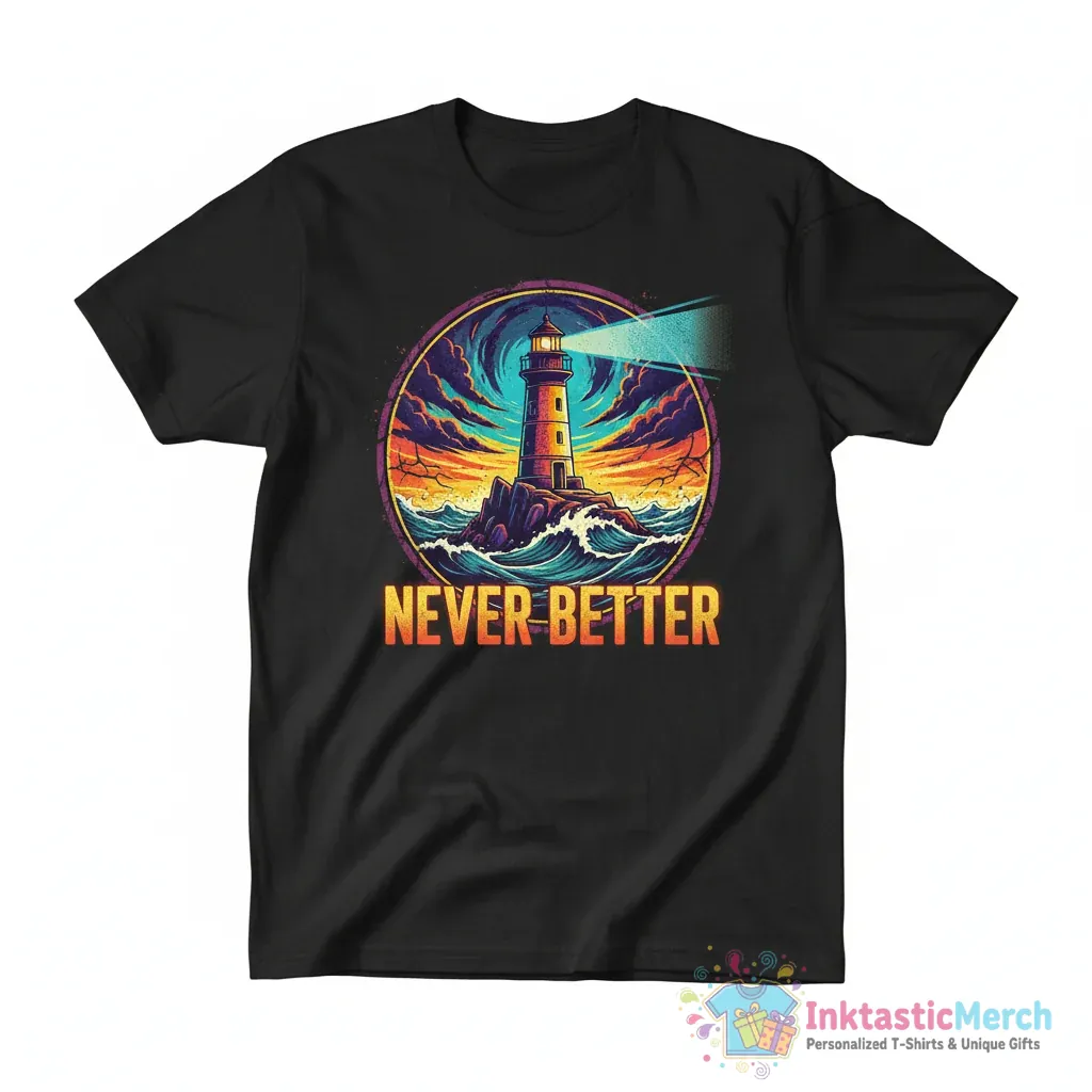Express your peak positivity with the premium quality “Never Better” T-shirt from inktasticmerch.com. Crafted from ultra-soft, breathable fabric, this tee offers supreme comfort for all-day wear, making it a durable and stylish staple for any wardrobe. Its unique, uplifting design ensures you’ll look and feel your absolute best, turning heads and spreading good vibes effortlessly.