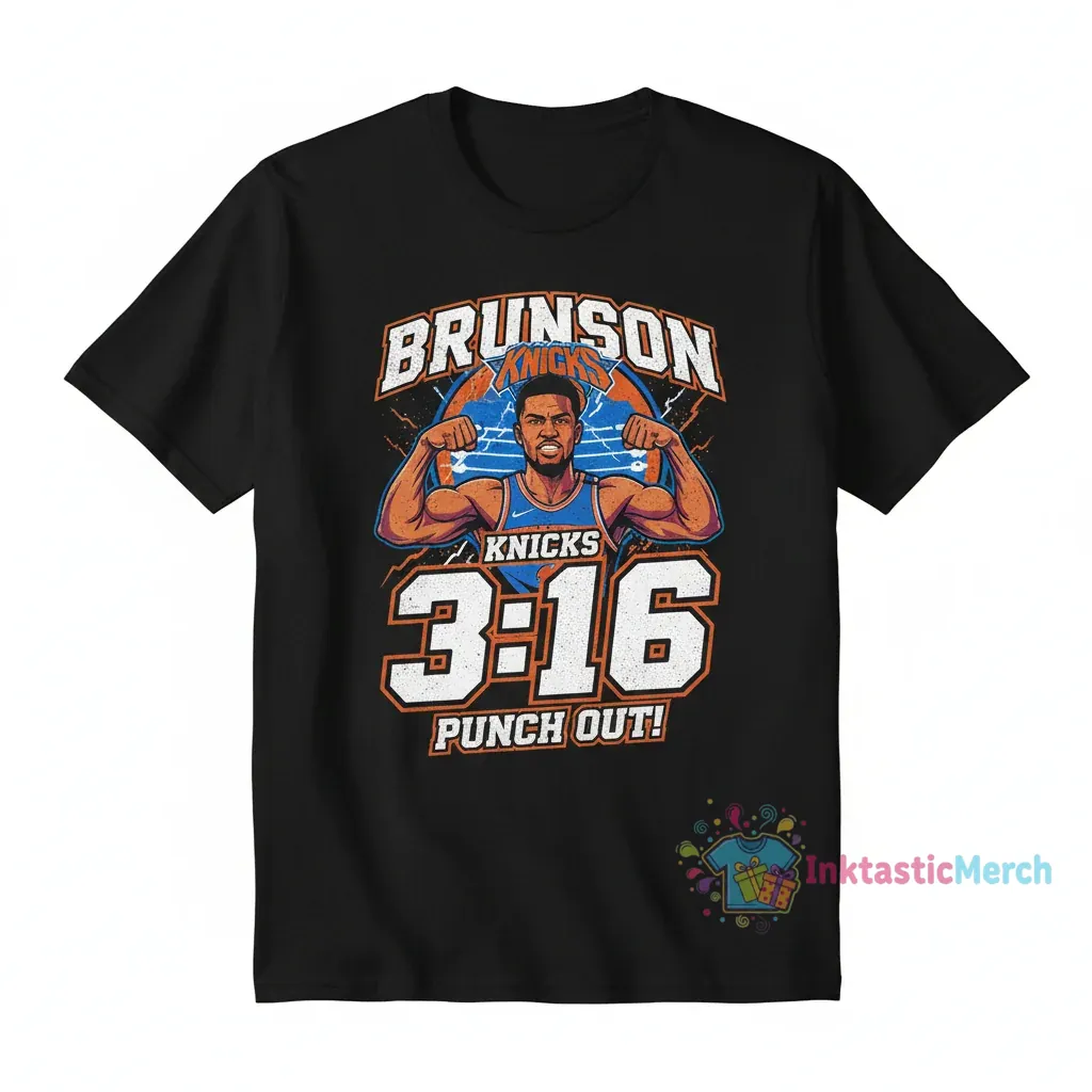 Show your unwavering support for the New York Knicks and the legendary 3:16 catchphrase with this exclusive Knicks WWE Jalen Brunson 3:16 T-Shirt. Crafted from 100% ring-spun cotton for superior softness and breathability, and featuring side-seamed construction for a tailored retail fit, this tee is built for ultimate comfort and longevity. Discover more quality fan apparel at inktasticmerch.com.
