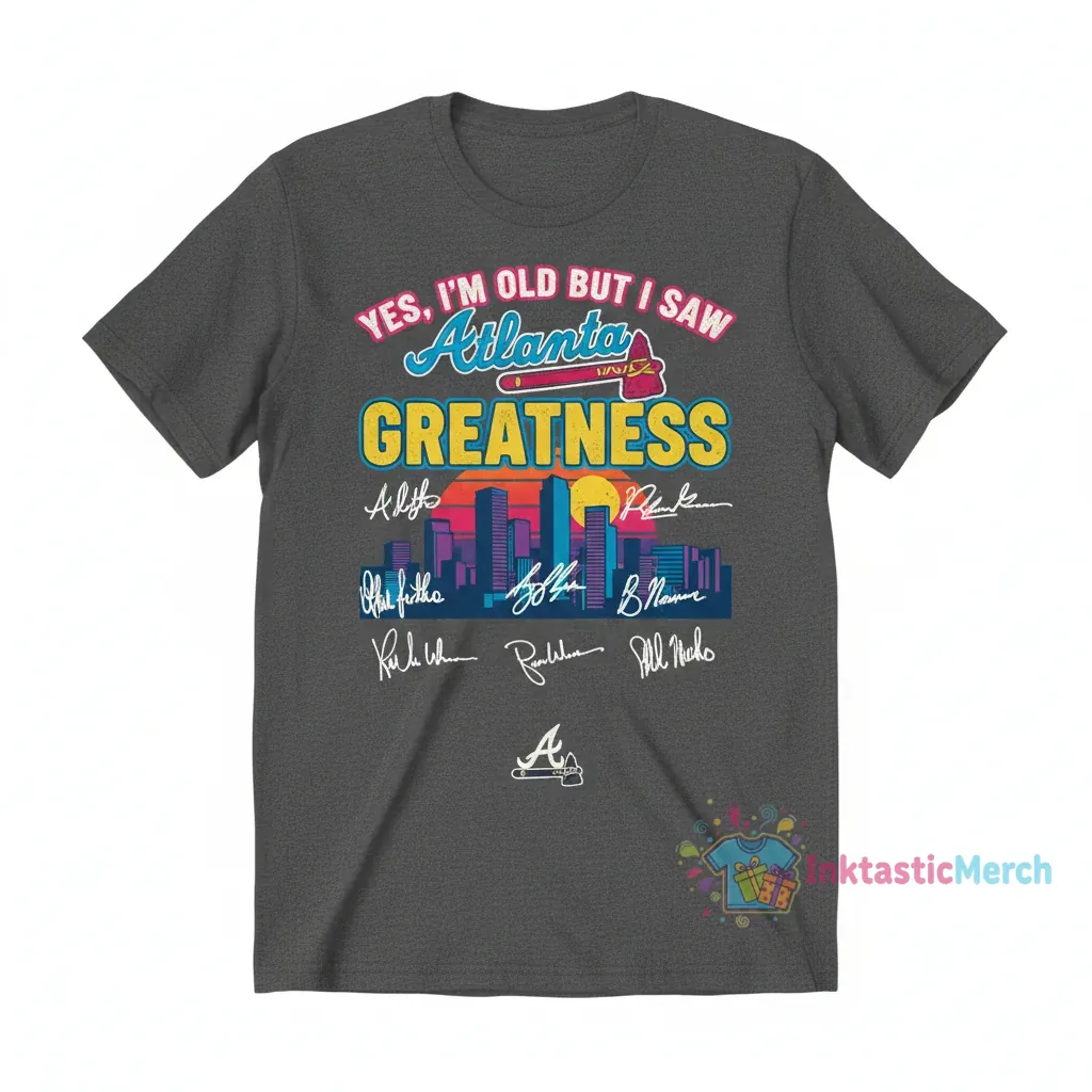 Show your love for the Atlanta Braves with this unique Niekro and legends yes I’m old but I saw Atlanta Braves greatness skyline signatures shirt. This tee celebrates iconic Braves moments and players, featuring a cool skyline graphic paired with legendary signatures. It’s the perfect way to reminisce about the team’s golden eras and wear your baseball pride. Whether you’re heading to the ballpark or just chilling at home, this shirt lets you carry a piece of Braves history with you. Celebrate the legends and the unforgettable times you witnessed.