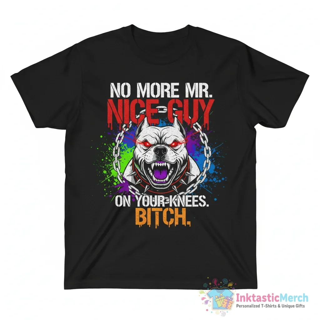 Unleash your inner rebel with the “No More Mr. Nice Guy on Your Knees Bitch” shirt from InktasticMerch. Crafted from ultra-soft, premium quality cotton, this tee offers superior comfort and a durable fabric that holds its shape and color wash after wash. It’s the perfect way to express your personality and stand out from the crowd with a bit of edgy humor.