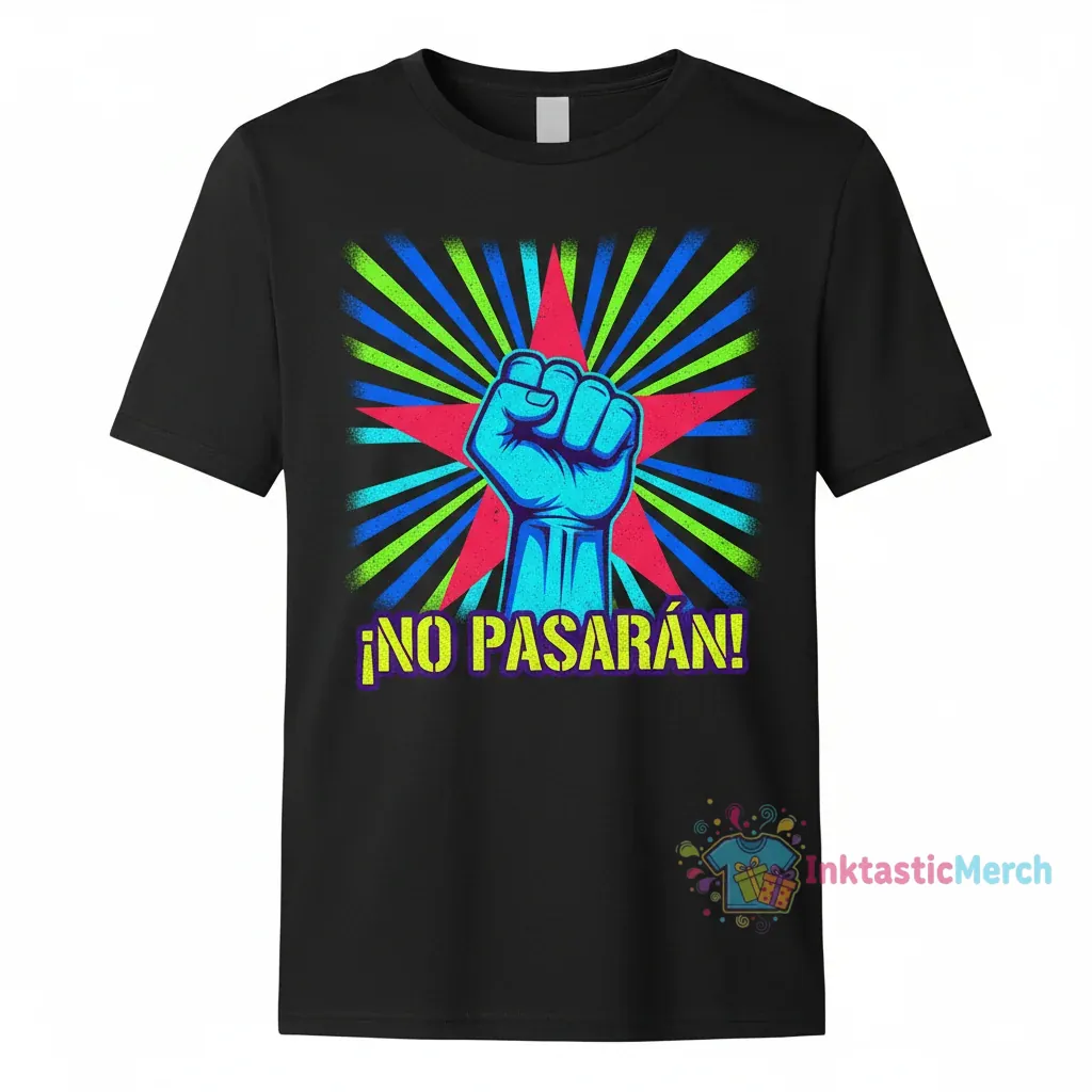 Make a powerful statement with the No Pasaran Fist Star T-Shirt, crafted from premium, heavyweight cotton for exceptional durability and a comfortable feel. This t-shirt, a symbol of resistance and unity, is brought to you by InktasticMerch, offering both meaningful messaging and everyday comfort that gets better with every wash.