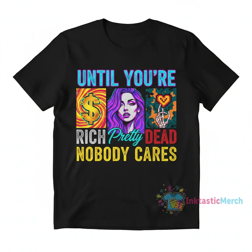 Make a bold statement with the Nobody Cares Until You’re Rich, Pretty, or Dead T-Shirt from InktasticMerch. This tee is designed for comfort that lasts all day, featuring ultra-soft, premium fabric and a durable, high-quality material built to last. Its impactful design is printed with high-quality ink, ensuring it stands out and stays vibrant wash after wash.