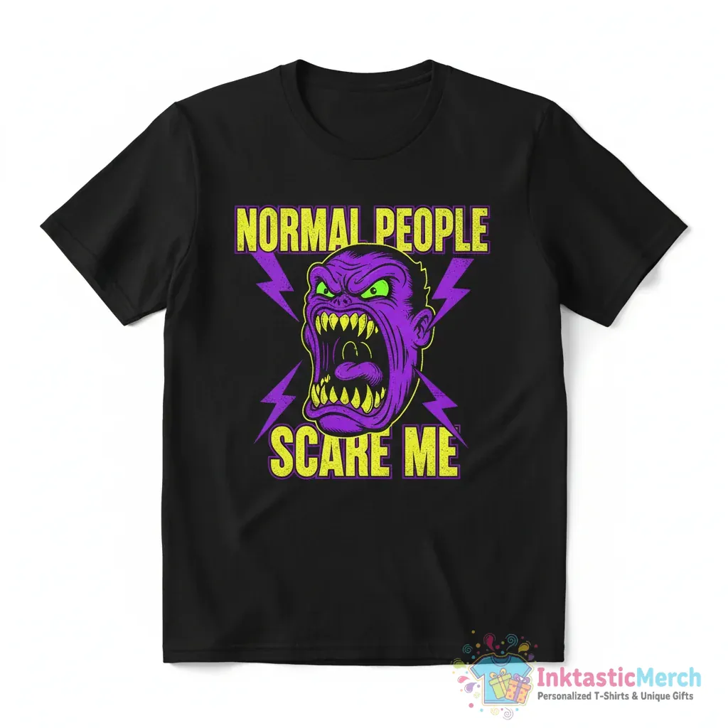 Embrace your unique vibe with the Normal People Scare Me shirt from inktasticmerch.com. Crafted for ultimate comfort and lasting wear, this t-shirt features a bold graphic that speaks volumes. Show off your personality and stand out from the crowd with this eye-catching design, made with ultra-soft, premium quality fabric for superior comfort.