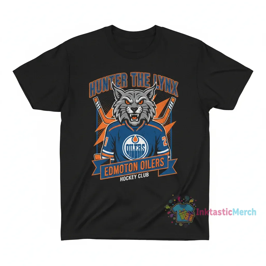 Show your Edmonton Oilers pride with the official Hunter the Lynx mascot highlight t-shirt, a must-have for any fan looking to represent their favorite NHL team. Made with super-soft fabric and featuring vibrant graphics, this tee is a comfortable and stylish way to cheer on the Oilers, ensuring it will be a favorite for seasons to come. Discover more fan apparel at inktasticmerch.com.