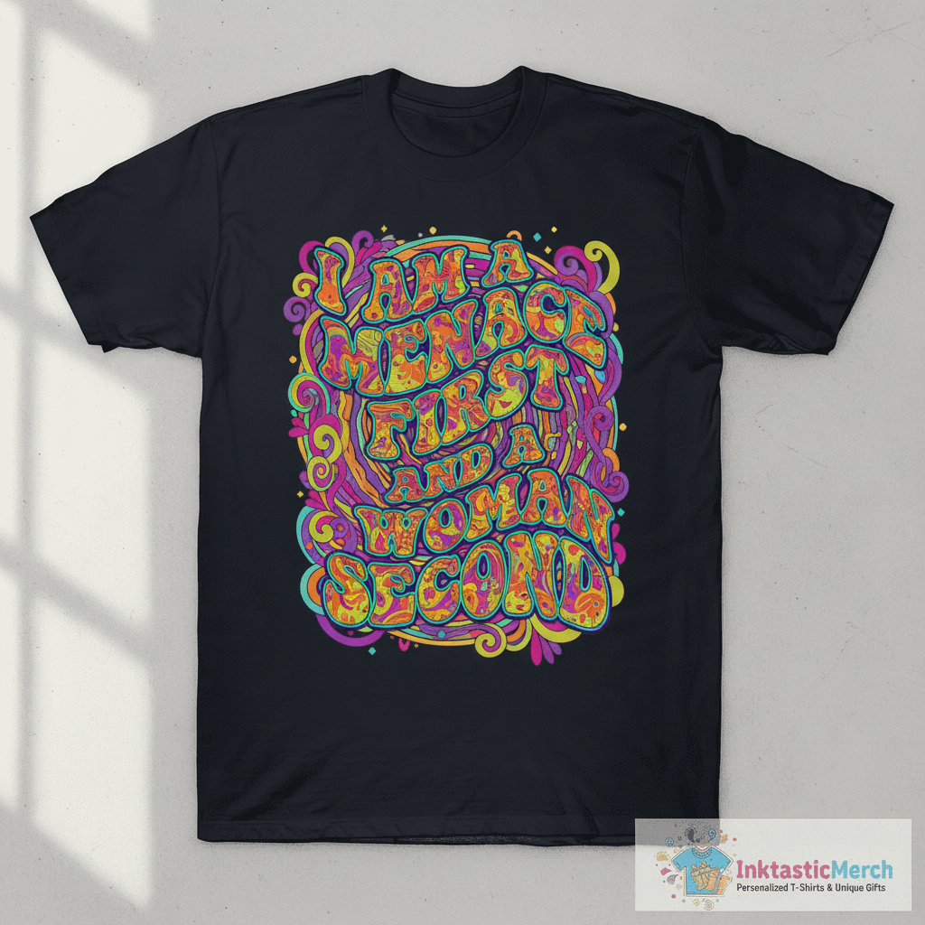 - Unique “I Am A Menace First And A Woman Second” graphic design.