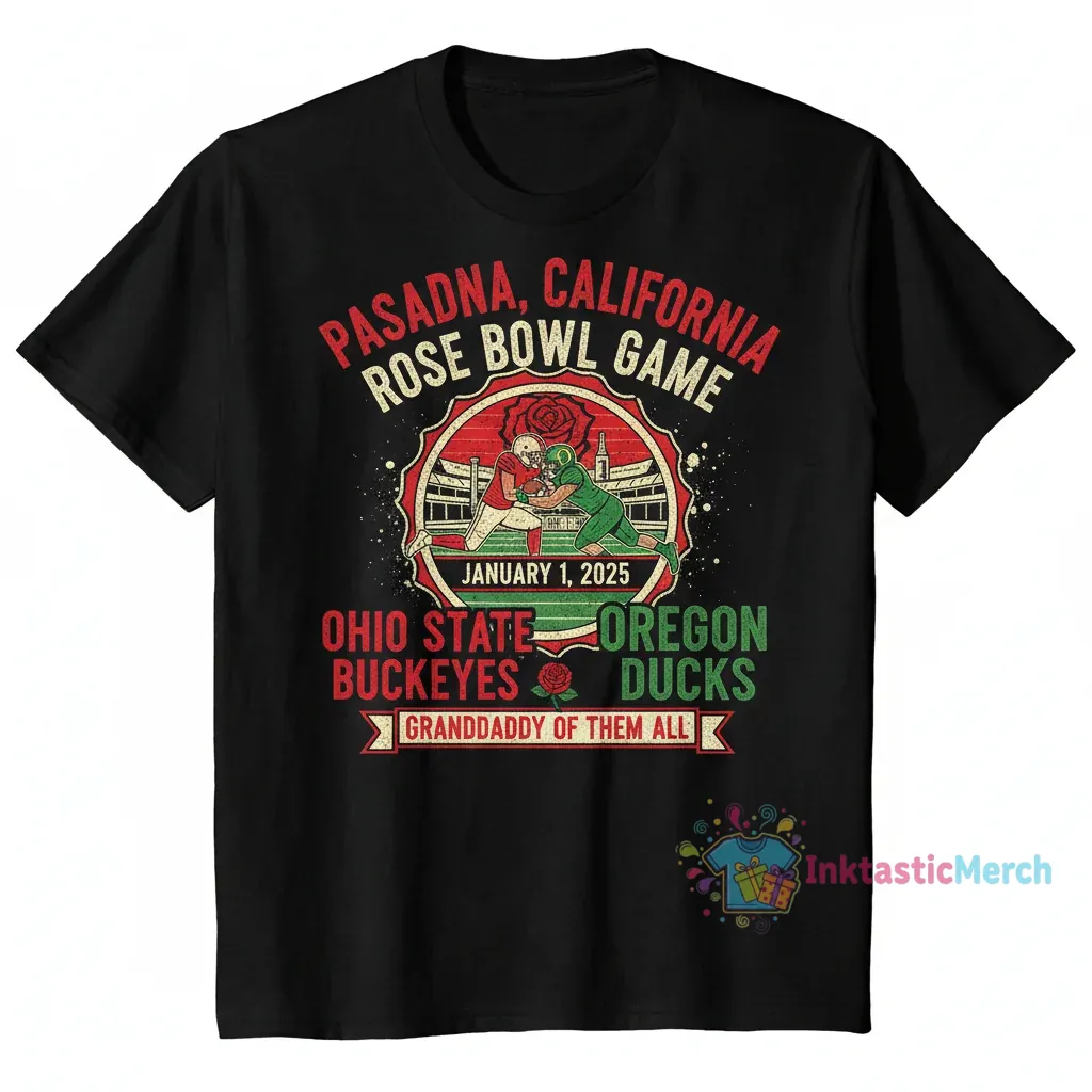 Celebrate the historic Rose Bowl Game with this exclusive Ohio State Buckeyes vs. Oregon Ducks T-Shirt, crafted from 100% ring-spun cotton for ultimate comfort and lasting style. Designed for a flattering retail fit and exceptional durability, this tee is a must-have for any fan. Discover more premium fan apparel at inktasticmerch.com.