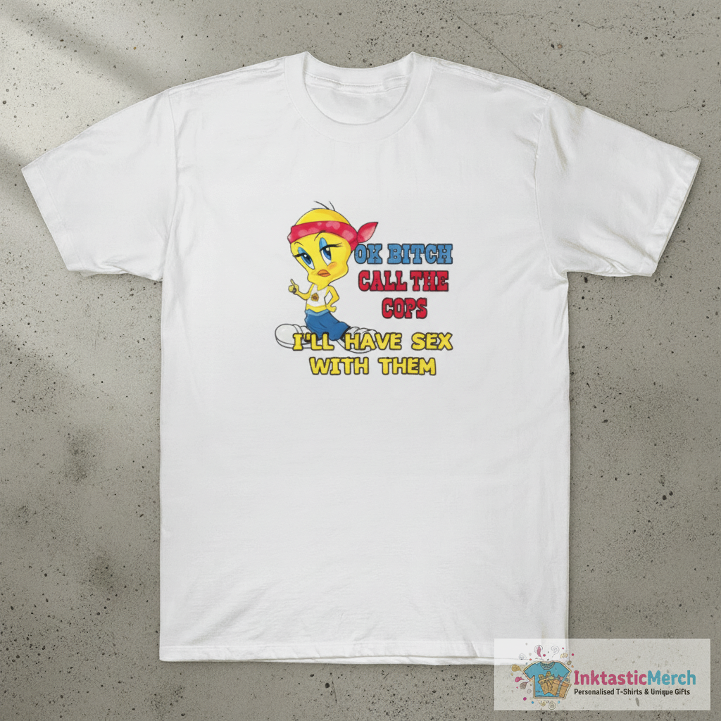Make a bold statement with the “Ok Bitch Call The Cops I’ll Have Sex With Them T-Shirt,” a tee designed for those who aren’t afraid to express themselves. Crafted from premium, ultra-soft cotton, this shirt offers an incredibly comfortable feel and durable, high-quality construction, reflecting the standards of InktasticMerch. Its versatile unisex fit ensures a flattering silhouette, making it the perfect blend of comfort and daring style.