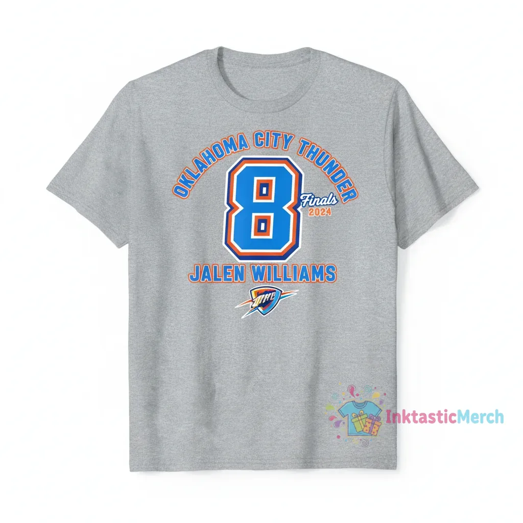 Show your unwavering support for the Oklahoma City Thunder and star player Jalen Williams with this premium NBA Finals-themed t-shirt, featuring his iconic #8 and name. This shirt is the perfect way for any dedicated fan to commemorate a significant season and showcase their team spirit. Designed for comfort and style, it’s an essential addition to your game-day wardrobe or casual wear, celebrating Jalen Williams’ impactful presence on the court during the NBA Finals. Represent your favorite team and player with this high-quality fan apparel.