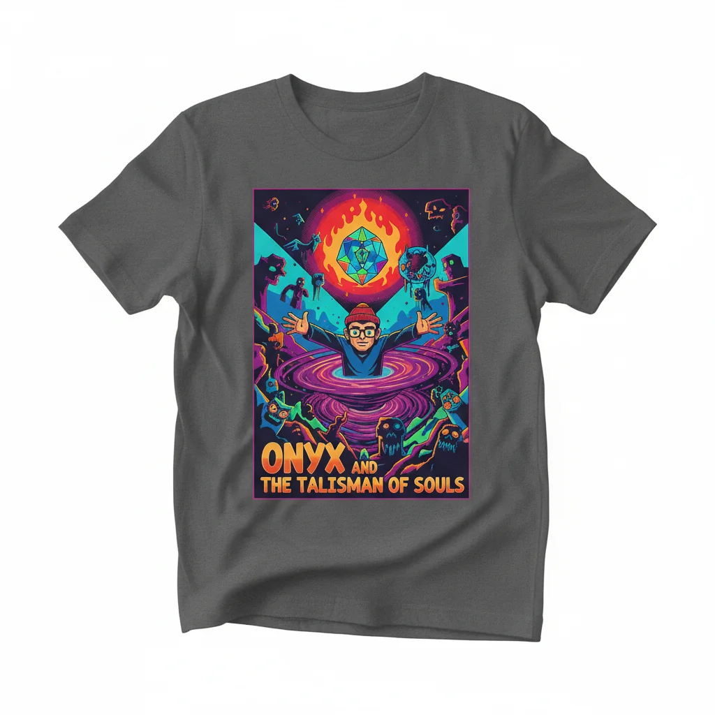 Celebrate the wonderfully weird world of the “Weird Satanist Guy” with the official Onyx The Fortuitous and The Talisman of Souls shirt. This isn’t just a piece of merchandise; it’s a badge of honor for fans of the epic occult comedy adventure. Featuring a striking design inspired by the movie, this t-shirt is the perfect way to show your allegiance to Onyx and his ghoulish gang. Whether you’re a long-time fan or new to the lore, this comfortable and stylish tee is a must-have addition to your collection, letting you carry a piece of the magic and mayhem wherever you go.