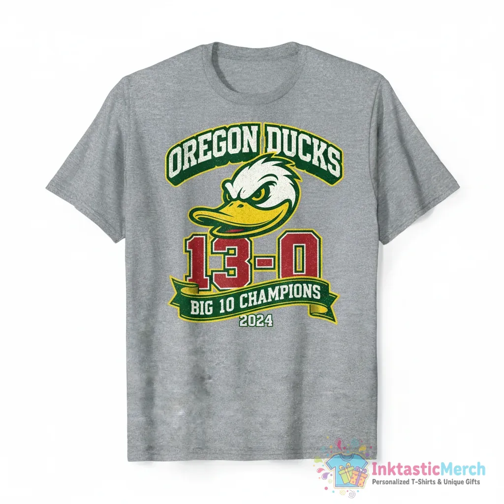 Celebrate the Oregon Ducks’ triumphant 13-10 Big 10 Championship with this must-have shirt! Crafted from super-soft, high-quality fabric by InktasticMerch, this tee offers ultimate comfort and style, proudly displaying the Ducks’ championship status.