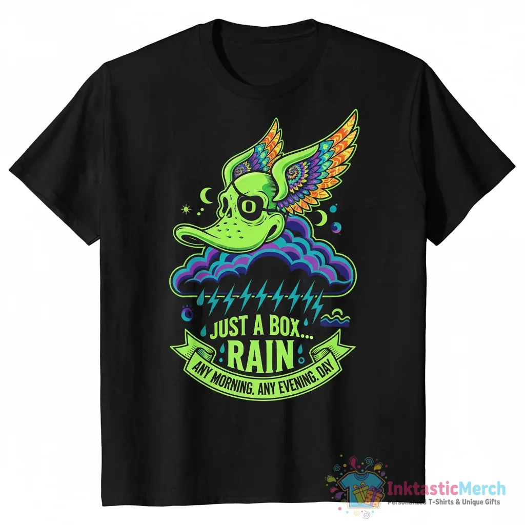 Show your love for the Oregon Ducks and the iconic Grateful Dead with this unique “Rain Just a Box” t-shirt. This premium quality tee captures the spirit of both legendary entities, making it a must-have for any fan. Whether you’re heading to Autzen Stadium or just chilling with friends, this shirt lets you wear your passion with pride. It’s more than just a t-shirt; it’s a statement piece that blends collegiate spirit with classic rock vibes. Get ready to turn heads and spark conversations with this one-of-a-kind design.