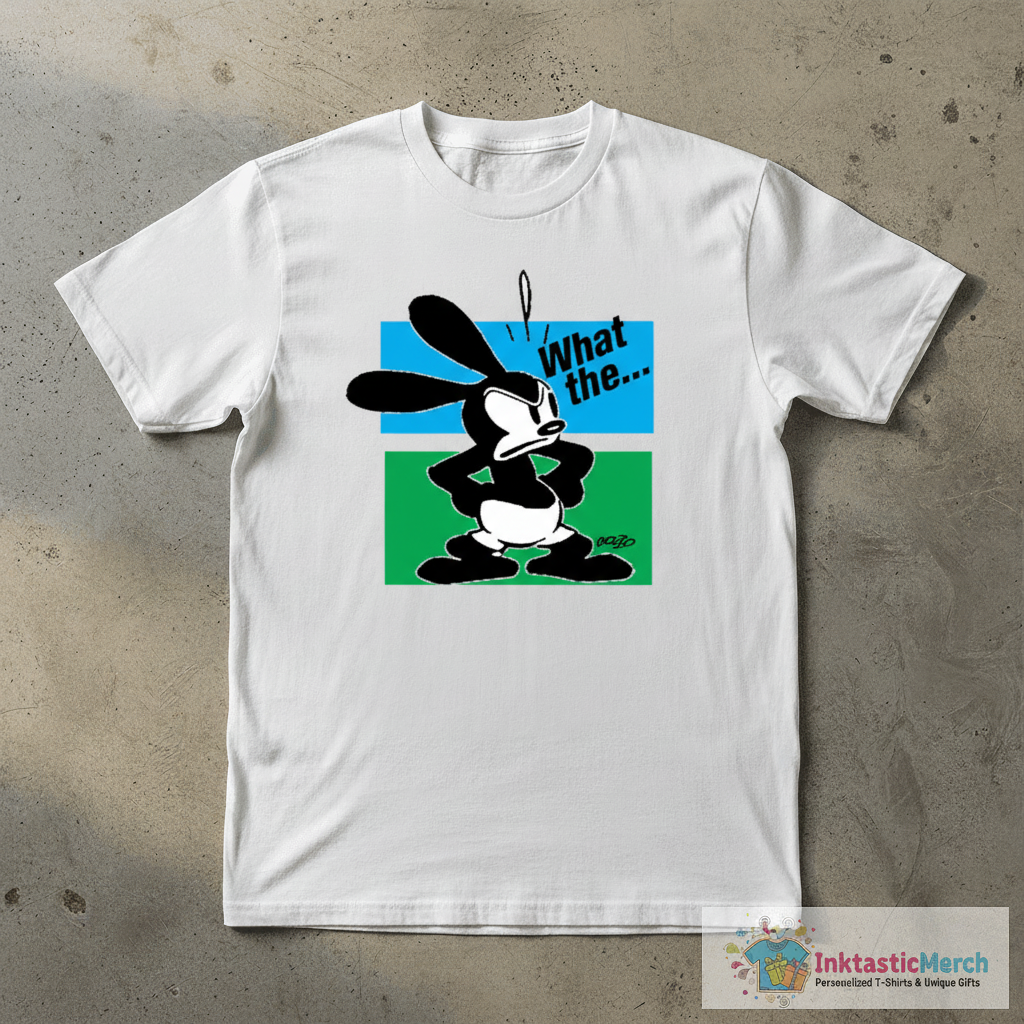 Unleash your inner cartoon fan with the Oswald Rabbit “What the…” T-Shirt from InktasticMerch. Crafted for ultimate comfort and lasting style, this tee features a hilarious and iconic Oswald the Lucky Rabbit design that’s sure to turn heads and spark smiles. It’s the perfect way to show off your love for classic animation with a touch of playful mischief.