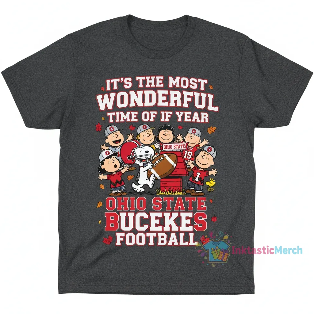 Celebrate the joyous season and your unwavering support for the Ohio State Buckeyes with this officially licensed Peanuts Snoopy and friends “It’s the Most Wonderful Time of the Year” football shirt. This premium tee perfectly blends iconic comic strip charm with passionate Buckeyes pride, making it an essential addition for any devoted fan looking to showcase their team spirit during the football season and beyond.