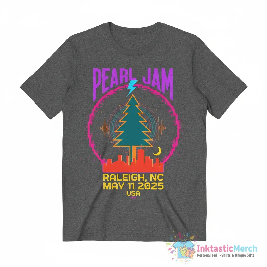 Show your love for Pearl Jam with this exclusive event poster T-shirt from their May 11, 2025 concert in Raleigh, NC, USA. This premium quality tee from InktasticMerch features a unique design inspired by the official event poster, making it a must-have for any dedicated fan and a wearable piece of music history.