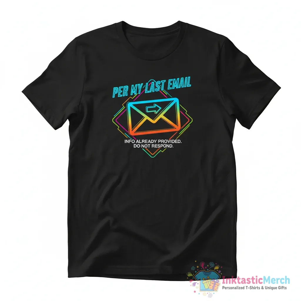 Make a statement with the Per My Last Email Shirt from InktasticMerch, a perfect conversation starter for those with a witty personality. Crafted for ultimate comfort and style with ultra-soft, premium fabric and durable construction, this shirt showcases your sense of humor and impeccable taste, making it ideal for casual wear or office events.