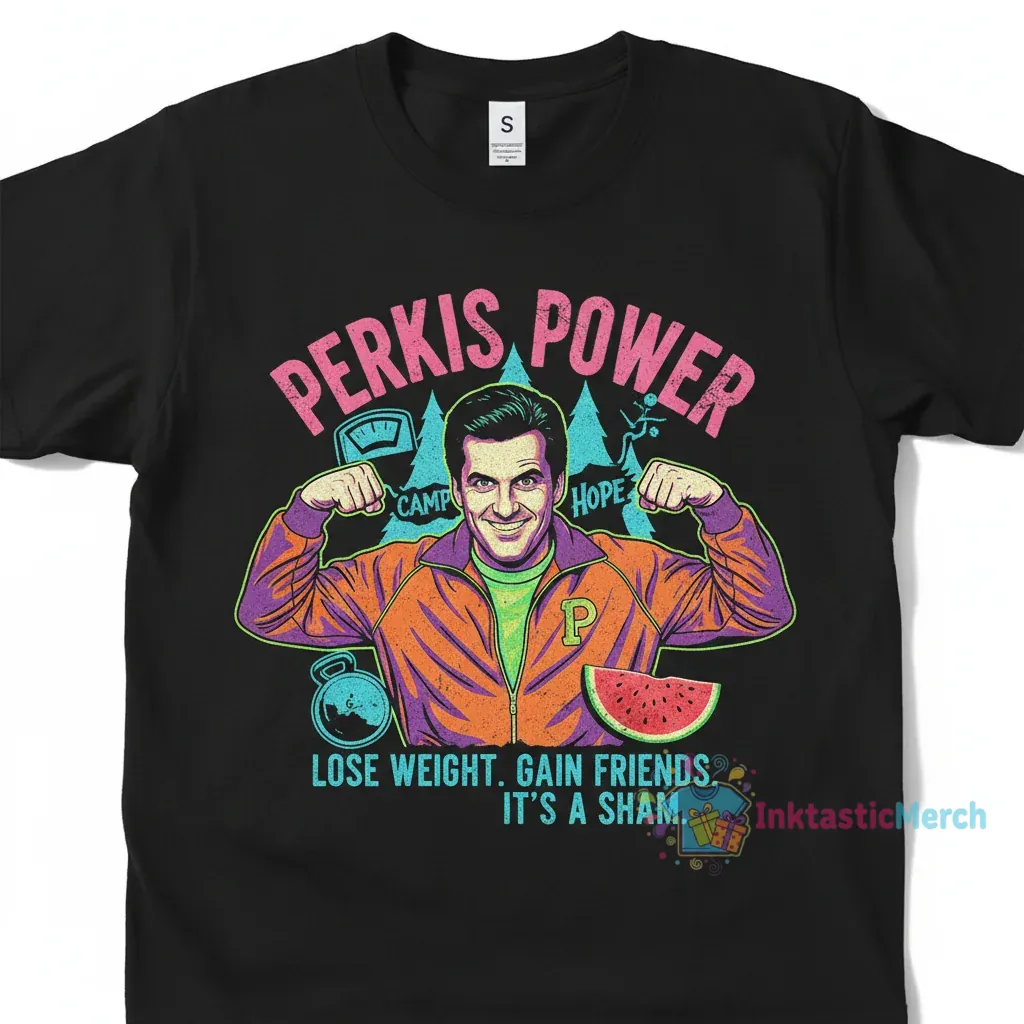 Show your love for the iconic Perkis Power T-Shirt, a tribute to the hilarious world of Heavyweights!