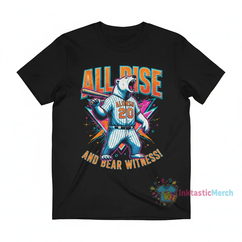 All rise and bear witness to the power and spirit of Pete Alonso, captured in this electrifying artwork. Inspired by the “Polar Bear’s” commanding presence on the field and his iconic “All Rise” call to the crowd, this shirt is more than just apparel – it’s a wearable testament to passion, dedication, and the thrill of the game. We wanted to create a design that resonated with fans, a piece that embodies the energy and excitement Alonso brings every time he steps up to the plate. It’s a celebration of that unforgettable moment when the stadium roars, and you feel the collective anticipation build.