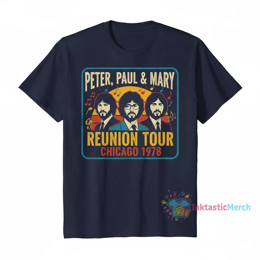 Relive the iconic Peter Paul and Mary Reunion Tour Chicago 1978 with this authentic vintage t-shirt from InktasticMerch. Crafted from 100% ring-spun cotton for exceptional comfort and durability, this premium tee captures the spirit of a legendary musical event, offering a piece of history for your wardrobe.
