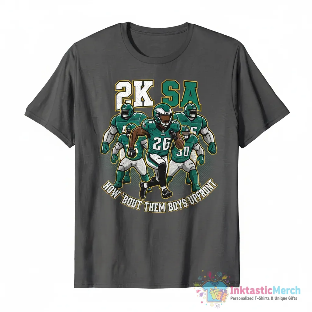 Show your Philly pride with this unique Philadelphia Eagles Saquon Barkley 2K SA caricature shirt! This tee captures the excitement of “how ’bout them boys upfront” with a fun, eye-catching design. It’s the perfect way to celebrate your favorite player and team. Made with premium quality materials, this shirt is built to last and keep you comfortable all day long. Whether you’re heading to the game, hanging out with friends, or just cheering from your couch, this shirt lets you represent the Eagles in style. Get yours and join the Eagles nation!