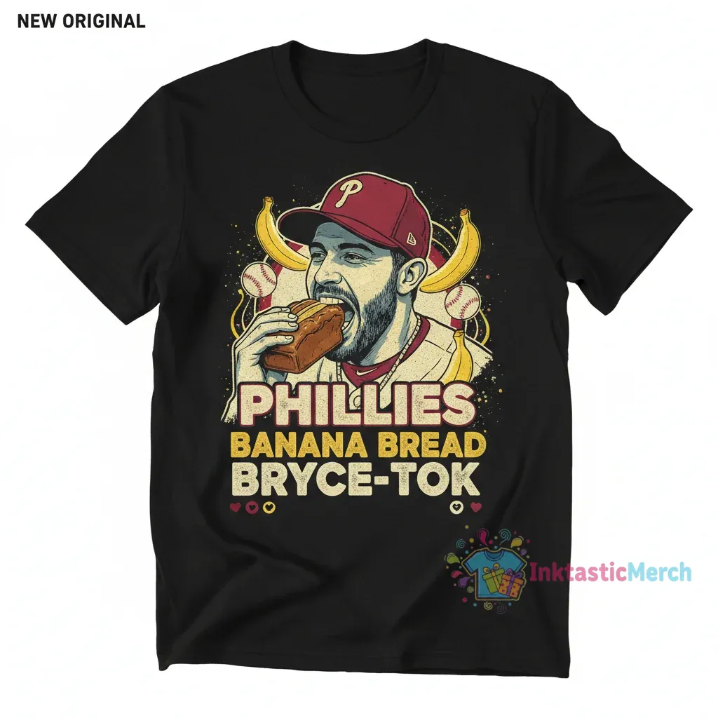 Showcase your love for the Philadelphia Phillies and Bryce Harper with this unique “Bryce-Tok” Banana Bread T-Shirt. This high-quality graphic tee is a must-have for any dedicated fan, blending pop culture trends with your favorite baseball star. Perfect for game days, casual outings, or just relaxing, this shirt is designed to be a conversation starter and a staple in your sports apparel collection.