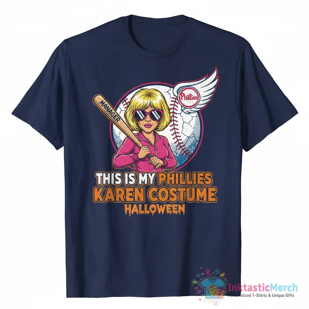 Show your Philly pride and Halloween spirit with the hilarious Phillies Karen Halloween Costume shirt. Designed for ultimate comfort and lasting wear with high-quality fabric, this InktasticMerch Statement Tee is a conversation starter perfect for parties or making a statement. Find your fan-favorite design and express your clever side at inktasticmerch.com.