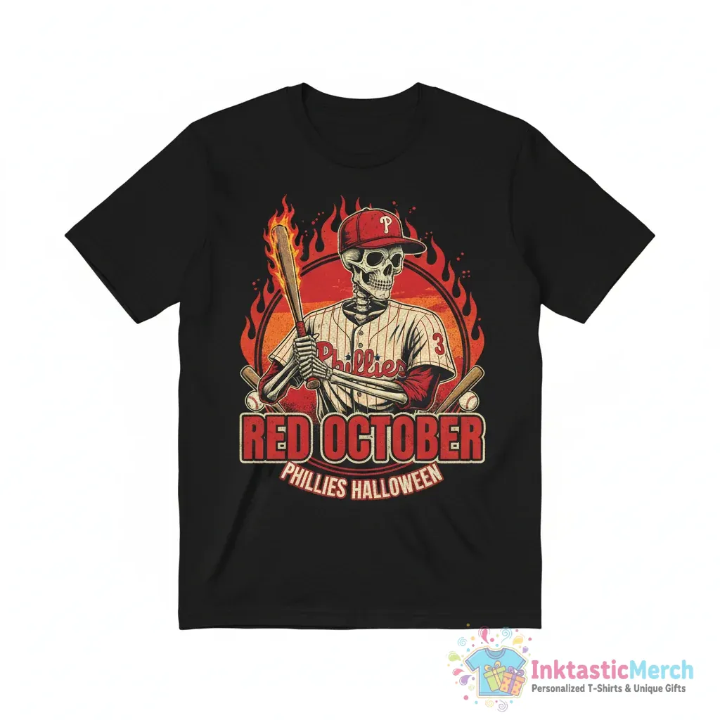 Show off your team spirit with the exclusive Phillies Red October Skeleton Player Halloween shirt! Made from high-quality, ultra-soft fabric, this tee offers incredible comfort and a premium feel, designed to be your new go-to. The durable print ensures the eye-catching skeleton player artwork looks fantastic wash after wash, all available at inktasticmerch.com.