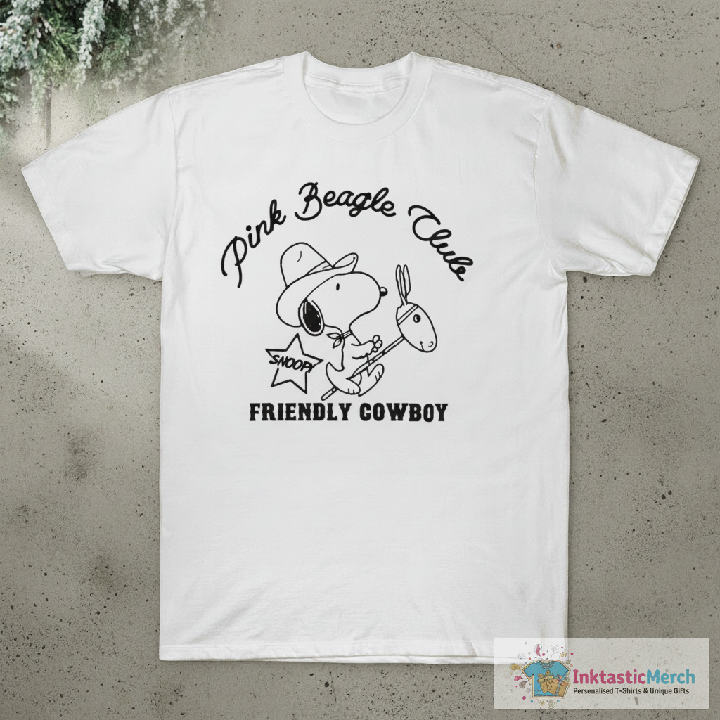 Unleash your inner cowboy with the Pink Beagle Club Snoopy Friendly Cowboy T-Shirt from InktasticMerch. Crafted from ultra-soft fabric for all-day comfort and featuring eye-catching Snoopy artwork, this tee is a high-quality statement piece for any fan. Show off your unique style and love for Snoopy with this durable and versatile unisex fit.
