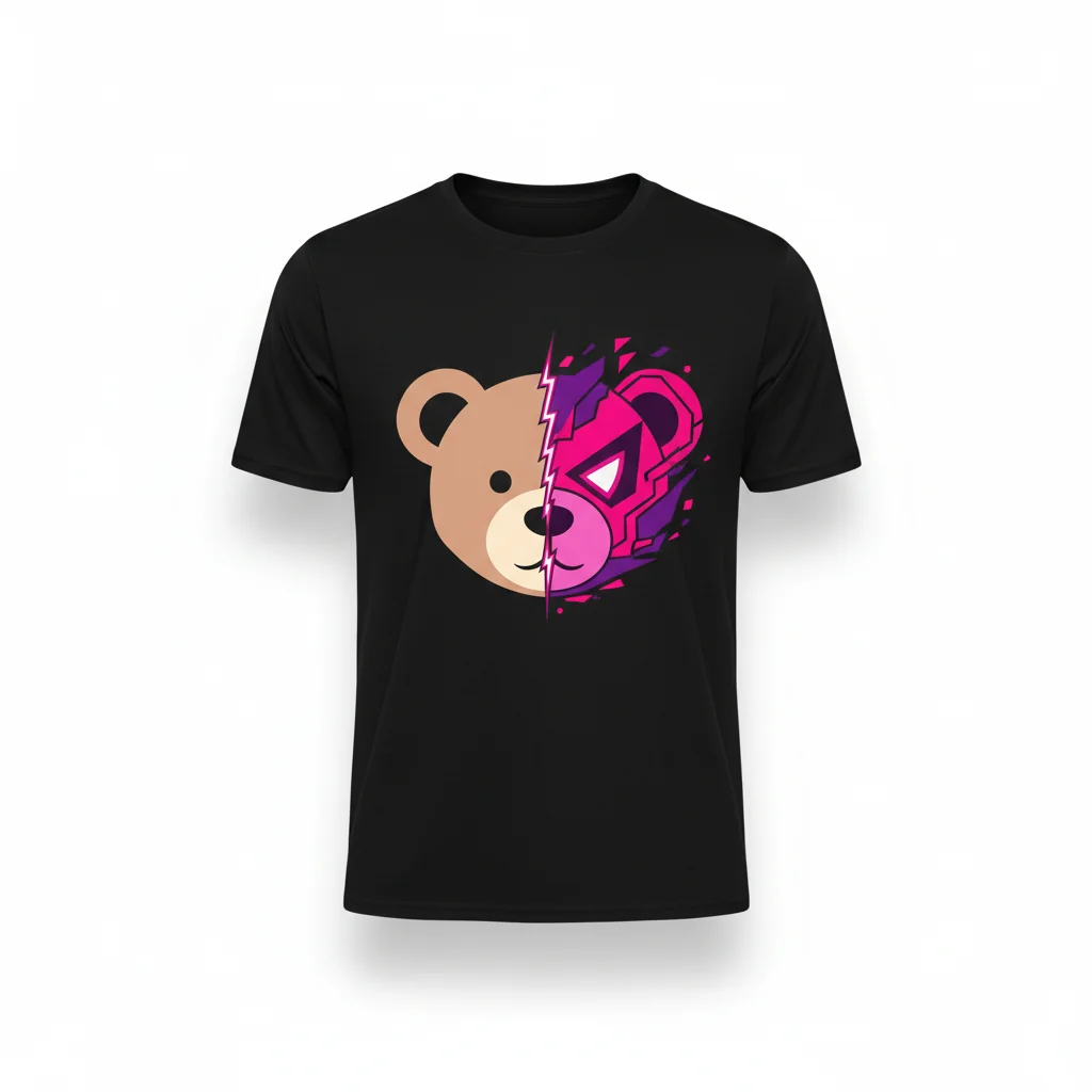 Show off your playful and edgy side with our pink two-faced teddy bear t-shirt, a standout piece for any casual wardrobe. This isn’t just a t-shirt; it’s a statement. Featuring a captivating transformation design, this tee combines cute and mysterious vibes perfectly. The unique artwork of the two-faced teddy bear is sure to turn heads and start conversations wherever you go. Made from high-quality materials, this shirt is designed for ultimate comfort and lasting style, making it an instant favorite for everyday wear.