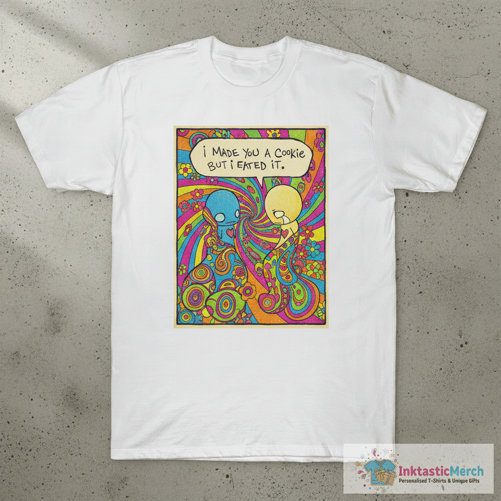 Get ready to turn heads and get compliments with this uniquely charming tee. The “Pon And Zi I Made You A Cookie But I Eated It Shirt” isn’t just a piece of clothing; it’s a conversation starter. Its playful design captures a moment of pure, unadulterated honesty that many can relate to. Imagine the smiles and chuckles you’ll bring to friends, family, or even strangers when you wear this. It’s crafted from super-soft fabric that feels amazing against your skin, ensuring you stay comfortable all day long, whether you’re out running errands or just lounging at home. The vibrant print stays bright wash after wash, so your favorite funny shirt looks great for years to come.