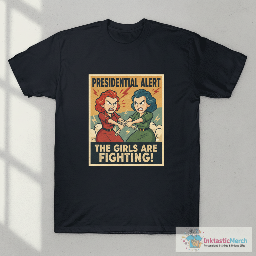 Make a statement with the Presidential Alert The Girls Are Fighting T-Shirt from inktasticmerch.com. Crafted from ultra-soft, premium cotton blend fabric, this tee offers both exceptional comfort and durable construction for long-lasting wear. Its breathable material and classic unisex fit make it a versatile addition to any wardrobe, perfect for casual outings and sparking conversations.