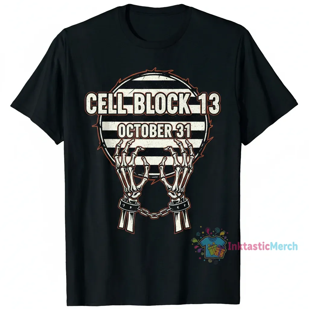 Step into character with the iconic Prison Inmate Black and White Stripes Halloween Costume T-Shirt, a striking design that captures the essence of a classic look with artistic flair.