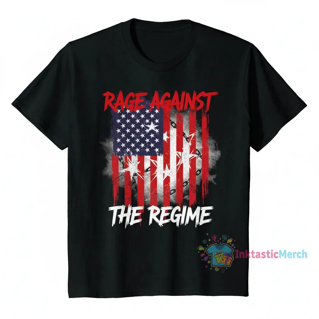 Make a powerful statement with the Rage Against the Regime American Flag Tee, crafted from 100% premium, pre-shrunk cotton for lasting comfort and a perfect fit. This durable tee features vibrant, eco-friendly inks that resist fading, ensuring your bold expression of patriotism remains brilliant. Explore more quality apparel at inktasticmerch.com.