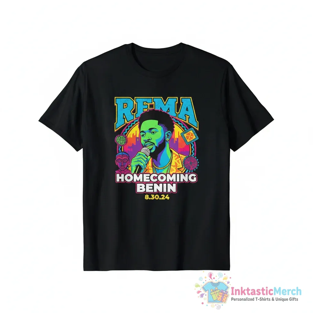 Show your pride and spirit with the Rema Homecoming Benin Shirt. This premium quality tee is designed for ultimate comfort and style, making it a must-have for anyone celebrating or representing Benin. Discover more about quality apparel at inktasticmerch.com.