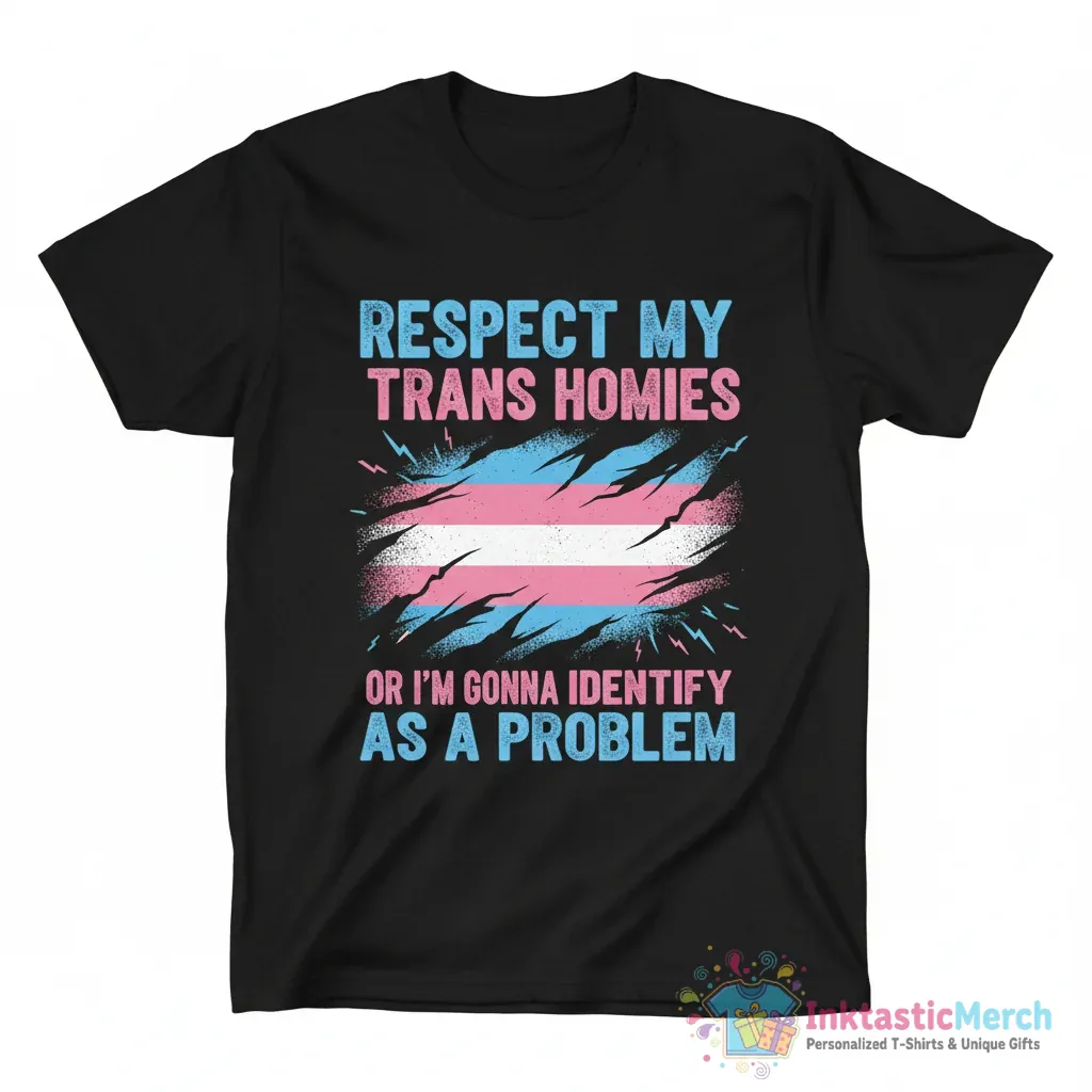 Show your support and pride with the “Respect My Trans Homies or I’m Gonna Identify as a Problem” Transgender Flag Shirt from InktasticMerch. This tee is crafted for comfort and designed to stand out, offering a bold and positive declaration of solidarity with the transgender community. Made from incredibly soft, premium quality fabric, it ensures you feel as good as you look, making it a perfect way to express your allyship and personal style.