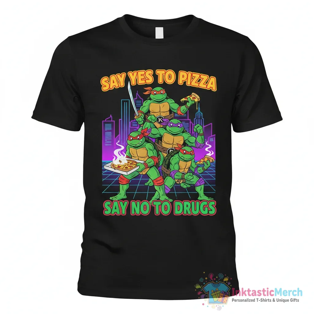 Fans of the classic Ninja Turtles, pizza lovers, 80s and 90s kids, or anyone looking for a fun and comfortable t-shirt. It’s ideal for casual days, movie nights, themed parties, or just showing off your unique style. This tee is a fantastic gift for friends and family who appreciate a bit of retro cool.