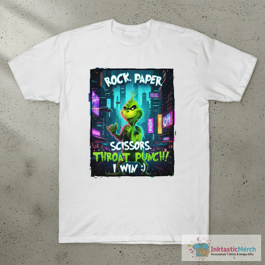 - Eye-catching “Rock Paper Scissors Throat Punch” Grinch design