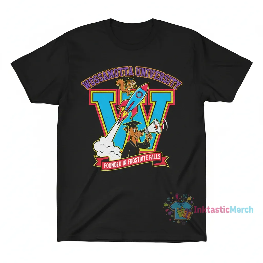 Upgrade your everyday style with the Rocky and Bullwinkle Wossamotta U Logo Shirt from InktasticMerch. Engineered for maximum comfort with premium, pre-shrunk heavyweight cotton, this tee ensures unwavering quality and a perfect fit wash after wash. It’s built to last, offering a substantial feel and fade-resistant graphics for timeless animation appreciation.