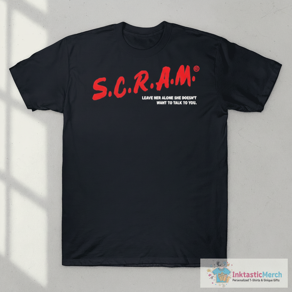 Make a clear statement with the S.C.R.A.M. Leave Her Alone She Doesn’t Want To Talk To You T-Shirt from InktasticMerch. Crafted from super-soft, high-quality fabric for ultimate comfort and featuring a durable, bold graphic print, this tee is designed to be seen and understood. It’s a wearable declaration of boundaries, perfect for expressing your personality and setting your space with confidence.