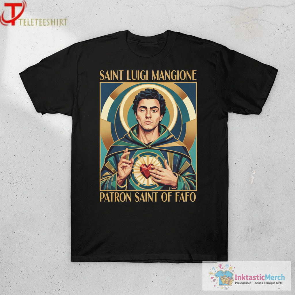Show off your unique sense of humor and style with the Saint Luigi Mangione Patron Saint Of Fafo T-shirt, crafted from premium, ultra-soft cotton for maximum comfort and durability. This tee features a bold and witty design, making it a perfect conversation starter and a comfortable way to express yourself. Explore more quality apparel at inktasticmerch.com.
