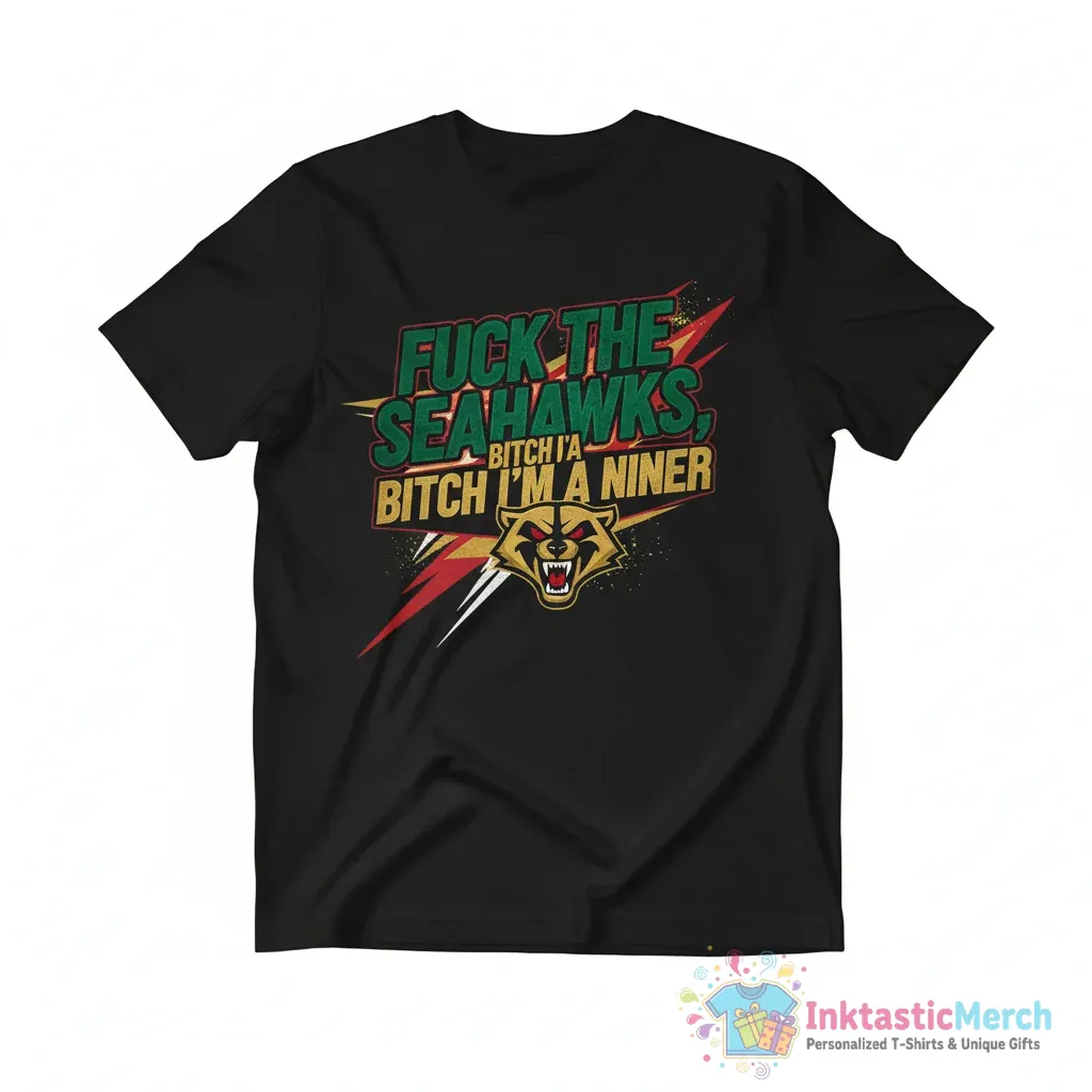 Show your undeniable San Francisco 49ers pride with the “Fuck the Seahawks, Bitch, I’m a Niner” shirt from InktasticMerch. Made from incredibly soft, premium fabric that’s gentle on your skin and designed with a durable print that lasts, this tee offers both comfort and lasting style for the true Niner Faithful.