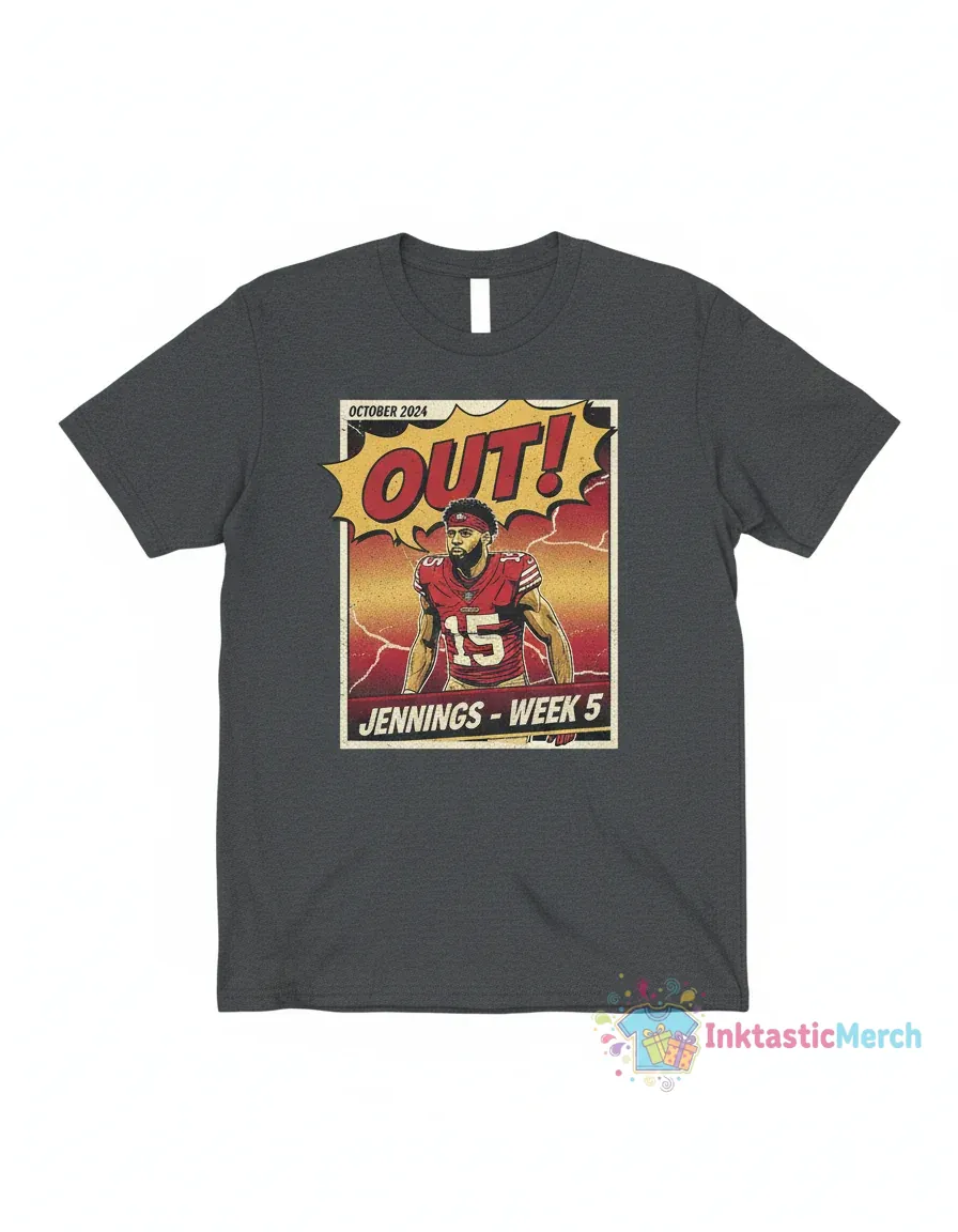 Show your support for the San Francisco 49ers with this unique Jauan Jennings “Ruled Out” Week 5 t-shirt, crafted for ultimate comfort and lasting wear from premium, soft-touch fabric. This durable tee, designed for a comfortable, relaxed unisex fit, lets you represent your team with pride and is a must-have for dedicated fans who follow the game closely, available now at inktasticmerch.com.