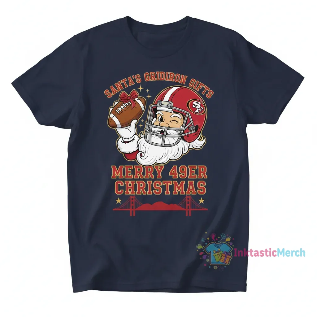 Celebrate the holidays in true Niner Nation style with the San Francisco 49ers x Santa Claus NFL Merry Christmas T-Shirt from InktasticMerch. Engineered for maximum comfort with a premium, pre-shrunk cotton blend and vibrant, eco-friendly inks that resist fading, this tee offers a perfectly tailored unisex silhouette designed to flatter all body types, blending passion for the 49ers with festive cheer.
